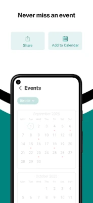 NEVER MISS AN EVENT The event section shows a list of events throughout the district. Users can add an event to their calendar to share the event with friends and family with one tap.