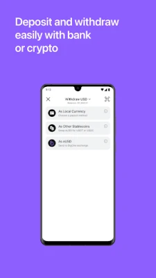 Top up or cash out using USDT/USDC or your local bank — all converted automatically to eUSD.